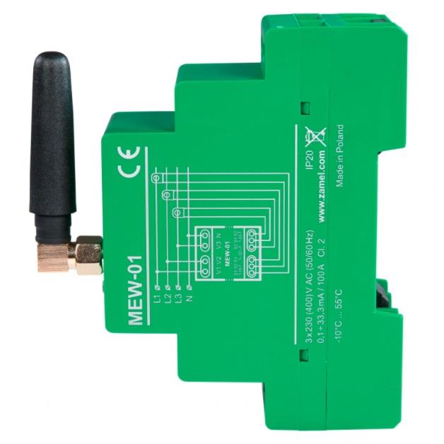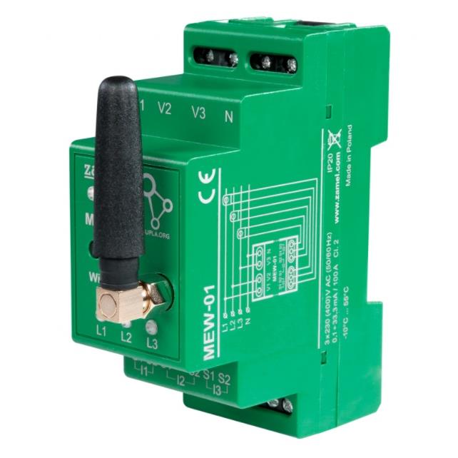 Monitor energii elektrycznej MEW-01 umożliwia kontrolę zużycia energii poprzez bezprzewodową sieć Wi-Fi. Monitor MEW-01 jest urządzeniem 3-fazowym, które w łatwy sposób montujemy w rozdzielni elektrycznej, bez dodatkowych kosztów wynikających z tworzenia specjalnej instalacji elektrycznej i telekomunikacyjnej. MEW-01 przeznaczony jest do montażu w szafach rozdzielczych na szynie TH35 (DIN). Urządzenie zajmuje dwa moduły. Ważnym elementem jest podłączenie przekładników prądowych 100A oraz anteny (znajdujących się w zestawie). W przypadku gdy antena musi być zainstalowana poza szafą rozdzielczą (dotyczy głównie rozdzielnic metalowych) to należy do tego celu wykorzystać antenę zewnętrzną. Antena posiada złącze typu SMA. Warto zwrócić uwagę na fakt, że MEW-01 umożliwia pomiar zużycia energii także na 1 fazie. MEW-01 jest urządzeniem dwukierunkowym rejestruje dane związane z energią pobraną oraz zwróconą. Urządzenie w zestawie zawiera dodatkową antenę zewnętrzną, którą można wyprowadzić na zewnątrz rozdzielni elektrycznej. Zestaw MEW-01/ANT-1F zawiera tylko 1 przekładnik SC-16, który umożliwia pomiar zużycia na 1 fazie. W przypadku gdy chcemy rozszerzyć pomiar o dodatkowy obwód to należy do urządzenia podłączyć przekładnik prądowy SC-16.